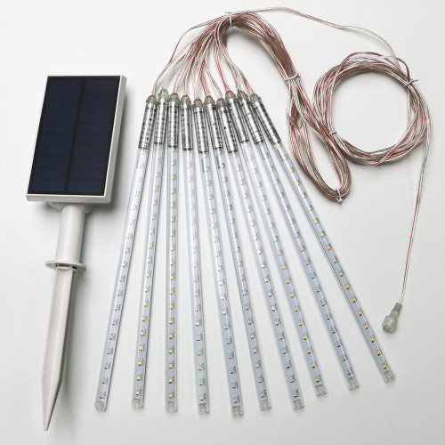 This solar LED drop meteor light set offers a stunning outdoor lighting solution, designed to create a mesmerizing cascading effect that mimics the brilliance of falling stars. Emitting a cool white glow, these meteor lights enhance the ambiance of gardens, patios, driveways, and festive settings with their radiant illumination. The set features ten individual meteor lights, each measuring 350mm and fitted with 36 high-performance LEDs, ensuring consistent brightness and a striking visual display. Connected by a transparent 13-meter cable with an 80cm separation between each light, these lights provide extensive coverage while maintaining an elegant, seamless aesthetic.