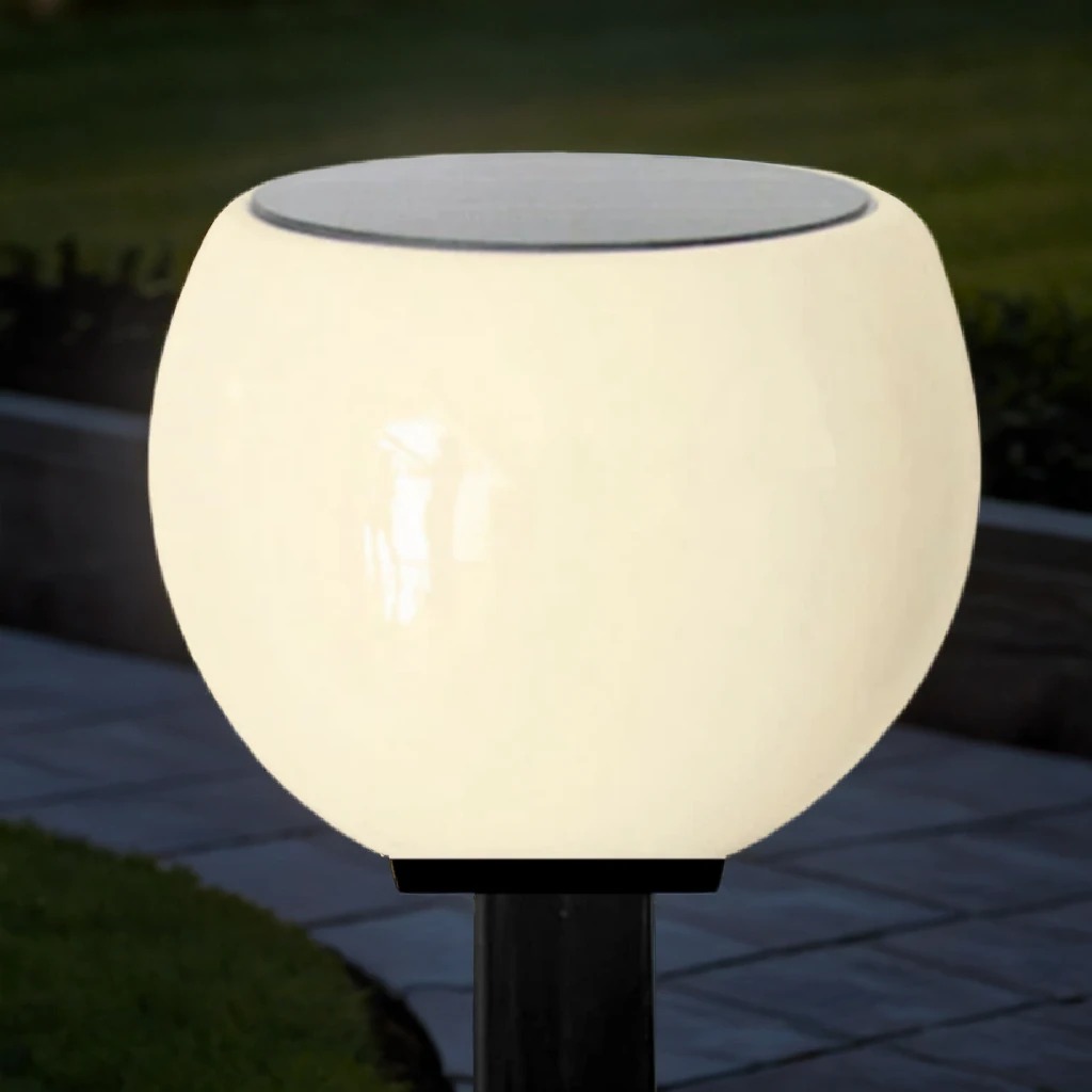 This solar sphere post top light combines refined aesthetics with advanced solar technology, offering an elegant yet highly functional outdoor lighting solution. Designed with a timeless spherical shape, it features an opal white polycarbonate diffuser that ensures uniform light distribution while enhancing the visual appeal of gardens, pathways, and residential or commercial landscapes. The fixture integrates seamlessly with various post heights, allowing for versatile placement, whether atop a tall street post or a lower fence-mounted installation. Its sophisticated design harmonizes with both contemporary and classical exteriors, providing a warm and inviting ambiance with its 200-lumen output in a soft warm white illumination.